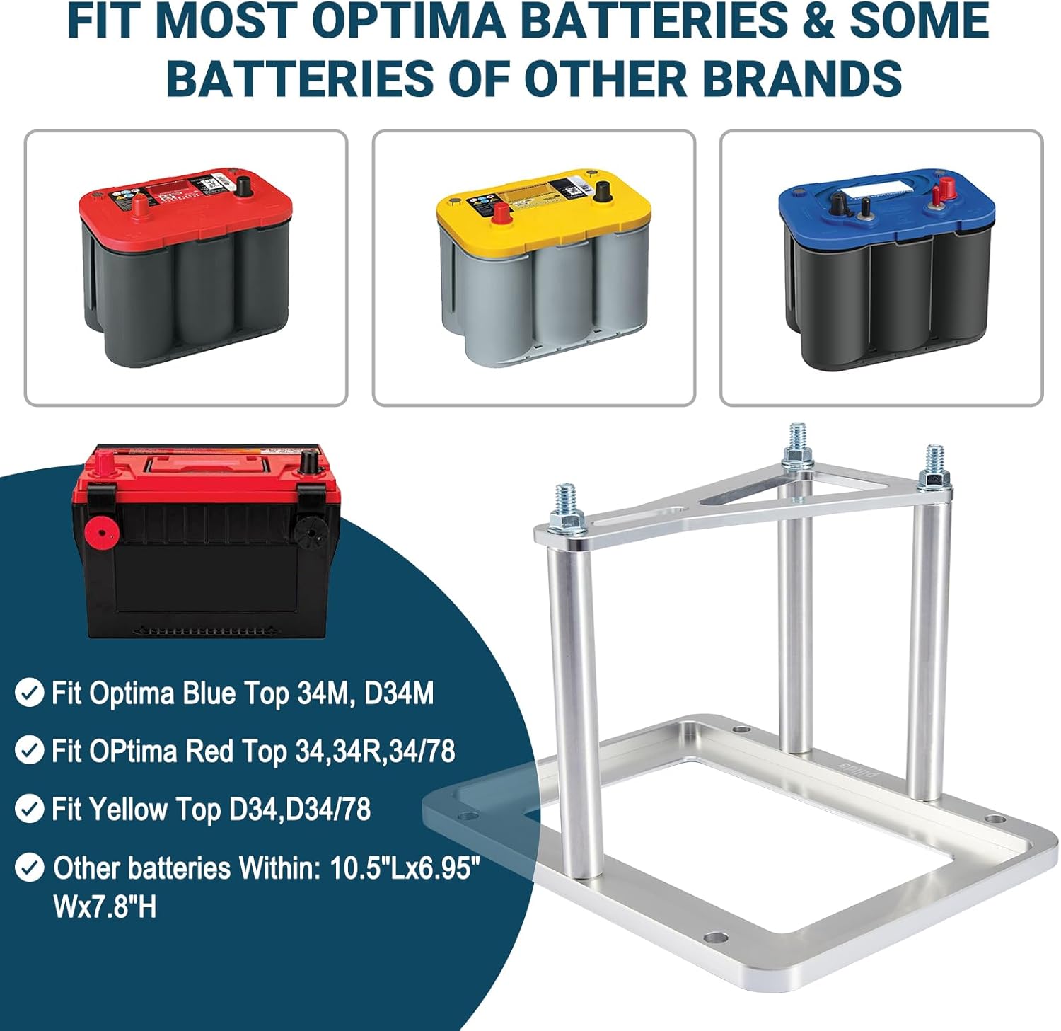 Battery Tray Compatible with Optima Blue, Red, Yellow Top Batteries – 34M, D34M, 34, 34/78, D34, D34/78 Aluminum Battery Mount